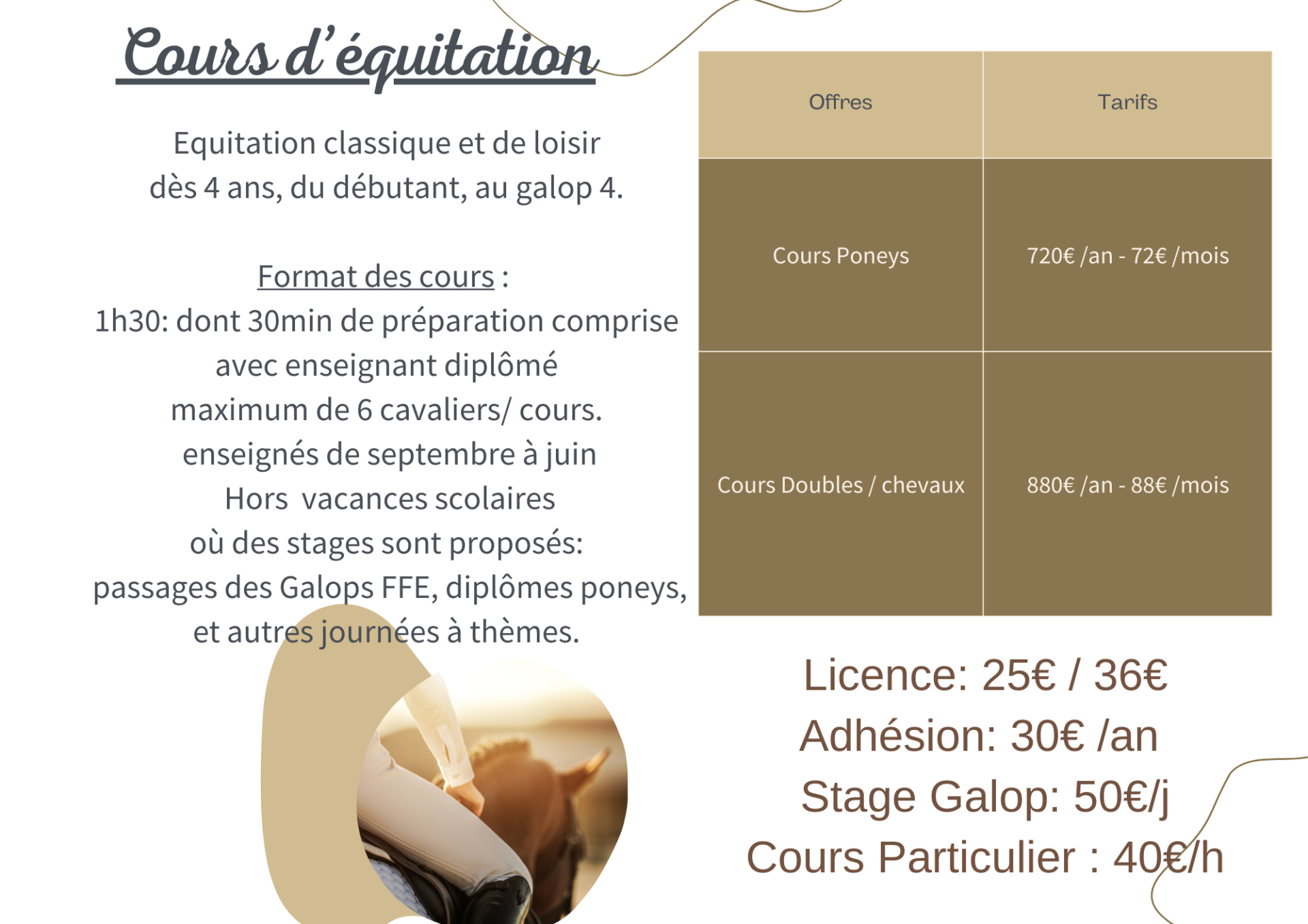 - Les cours sont basés sur 1h30 dont 30 min de préparation et 1h de cours en carrière ou en extérieur avec un encadrant